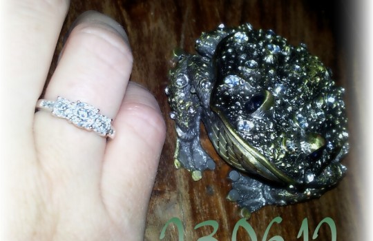 Æ kjente igjen frosken, å kjente at æ nesten ikke fikk puste... med bomull i hodet og ett låst smil (hva redd d æ skulla ta feil mtp ka æ trudde d kunne være) åpna æ den, å der fant æ ringen :) En nydelig diamantring med hele 39 diamanta - Æ vart mildt sagt sjokkert og glad på samme tia.