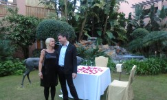 I mars 2012 hadde vi en herlig ferie i leiligheten til Ritha og Hans i Spania. Det Tine ikke visste, var at nettopp på denne turen hadde Håvard planlagt å fri.. En dag Tine satt hos frisøren på Gran Hotel Elba, kom Håvard og hentet henne og skulle vise henne den fine SPA-avdelingen på hotellet. Da vi stod og drømte om å kunne bo her en dag, så dro Håvard opp 2 nøkkelkort, og sa at DET skulle vi, i DAG faktisk:-) Tine ble hoppende glad, og gledet seg til å kose seg i SPA'et og sove i deilige hotellsenger. Håvard geleidet Tine opp på hotellrommet. Noe som viste seg å være den digreste penthouse-suiten vi begge noengang hadde sett! Der stod det en flaske champage, jordbær og varm sjokoladesaus og ventet på oss:-). Det var strødd roseblader på sengen, og blomsterdekorasjon stod på bordet. Vi koste oss med jorbær og champage (Tine drakk ikke, Mio lå nemlig i magen) på en gigantisk terasse med en fantastisk utsikt over havet. Om kvelden skulle vi ned å spise middag på restauranten "Paris and "Rome". På vei dit, ba Håvard Tine om å komme ut og se på den fine hagen.... Der kunne vi skimte en lite lekkert bord med hvit duk og 2 champagneglass. Det lå roseblader strødd over bordet:-) Så kom en kelner bort med en flaske champagne... DA begynte Tine å ane "ugler i mosen" :-) Mens vi nøt nydelig champagne, gikk Håvard plutselig ned på kne og fridde.... Samtidig kom det 3 "paparazzi-fotografer" løpende mot oss og begynte å knipse bilder. Dette var også en del av Håvards plan for kvelden! Vi fikk tatt en masse flotte bilder rundt på hotellet, og ved det romantiske middags bordet, som også var dekket med roseblader! En fantastisk dag og kveld!!! Neste dag koste vi oss i SPA'et og nøt vår nye sivilstatus. Det er vel nå ingen tvil om hva Tine svarte på Håvards frieri;-)
